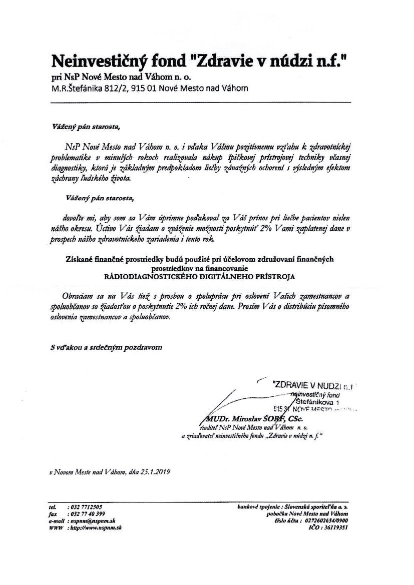 Darovanie 2% dane NsP Nové mesto nad váhom
